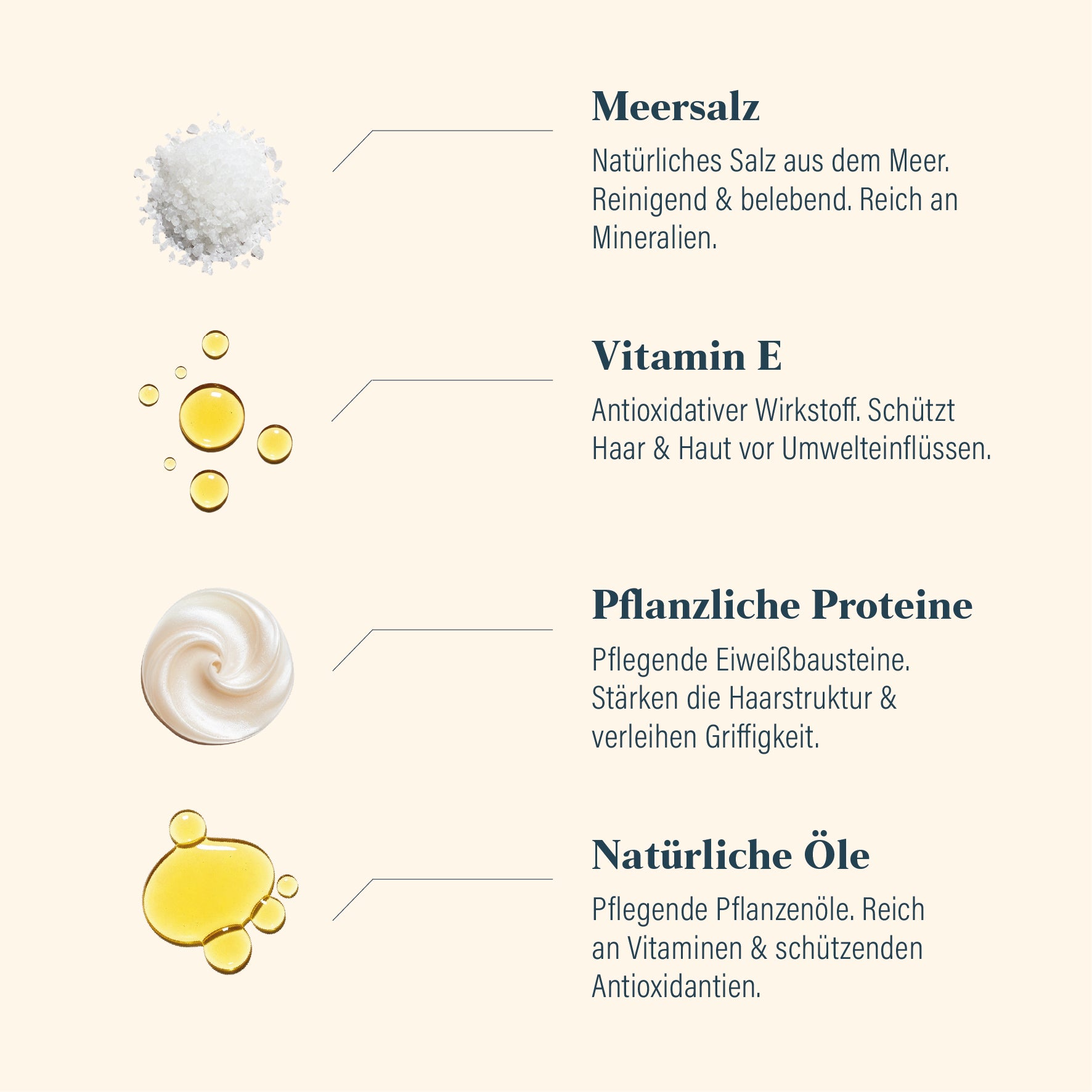 Unser SEA SALT SHAMPOO kombiniert die besten Inhaltsstoffe der Natur: Reiches Meersalz mit wertvollen Mineralien wie Magnesium, Kalzium und Kalium nährt die Haare tiefenwirksam und reguliert die Feuchtigkeitsbalance. Sonnenblumenöl spendet intensive Feuchtigkeit, während Seidenaminosäuren für geschmeidiges, glänzendes Haar sorgen. Vitamin E und A bieten antioxidativen Schutz gegen Umweltbelastungen und freie Radikale. Die sanfte Reinigungsbasis mit Kokosbetain sorgt für gründliche, aber schonende Reinigung ohne die natürliche Ölproduktion zu stören.