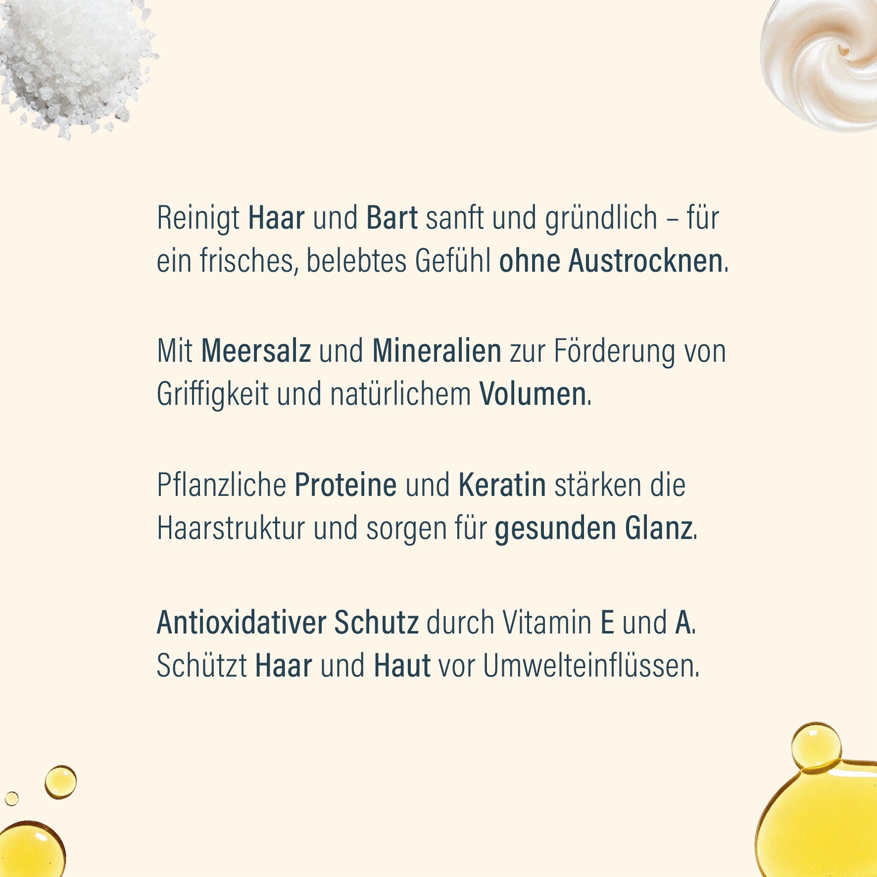 Das SEA SALT SHAMPOO ist dein ultimativer Allrounder – optimiert für Männer, die keine Kompromisse eingehen wollen. Anders als herkömmliche Shampoos ist es speziell für die Bedürfnisse von Haar UND Bart formuliert. Es reinigt ohne zu beschweren, pflegt ohne zu fetten und verleiht den natürlichen Glanz, den sowohl dein Haar als auch dein Bart verdienen.