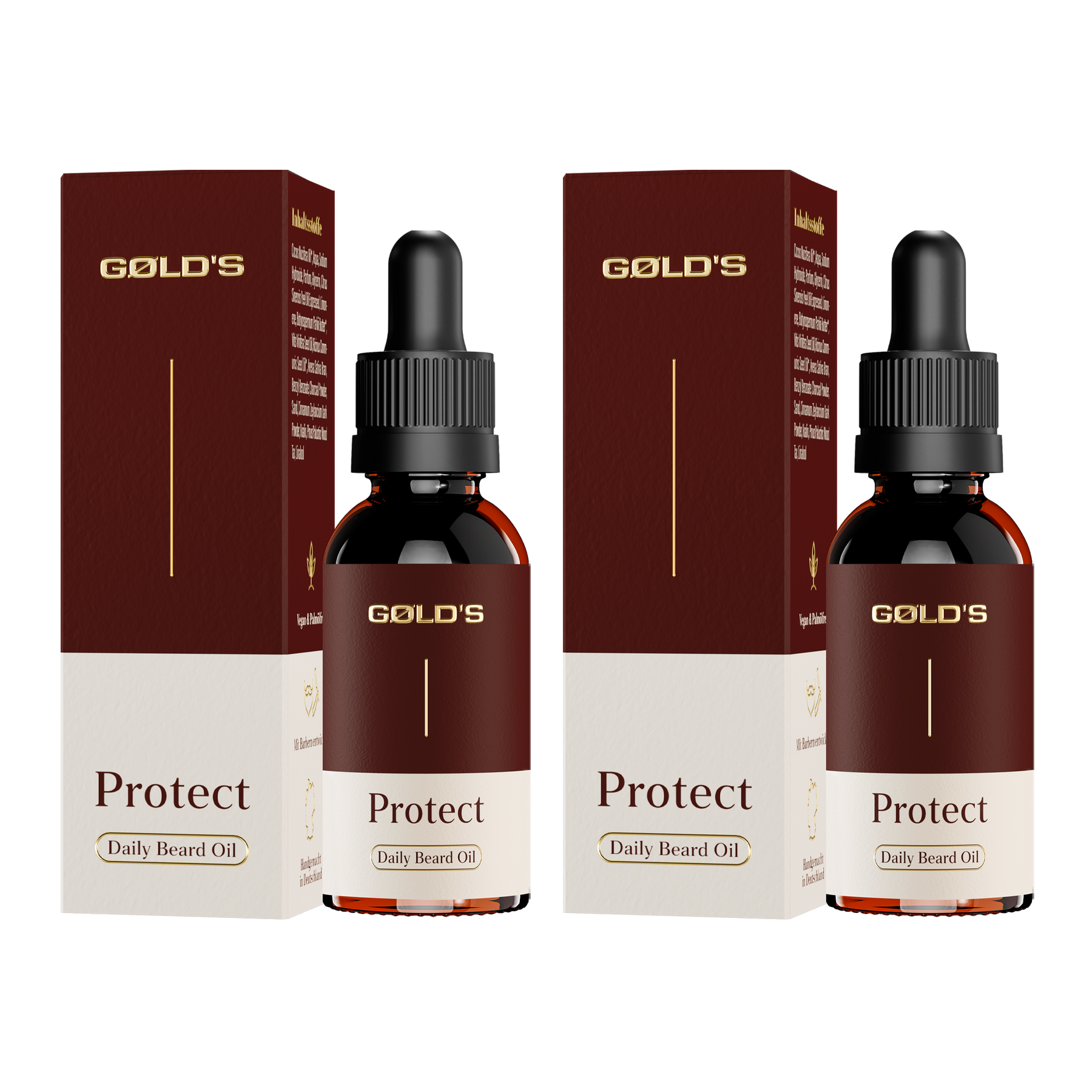 Doppelt so lange Freude an deinem gepflegten Bart – zwei Flaschen Bartöl Protect für intensive Pflege und den unwiderstehlichen GØLD's Duft.